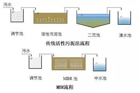 膜生物反應器(MBR)用膜對生化反應池內的含泥污水進行過濾,實現泥水分離。一方面,膜截留了反應池中的微生物,使池中的活性污泥濃度大大增加,達到很高的水平,使降解污水的生化反應進行得更迅速更徹底,另一方面,由于膜的高過濾精度,保證了出水清澈透明,得到高質量的產水。