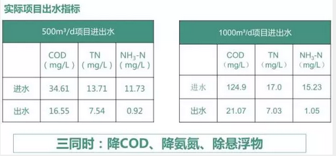 效果:處理生活污水時,系統出水水質優于《城鎮污水處理廠污染物排放標準》(GB18918-2002)一級A標準,其中CODcr、BOD5、氨氮可達到地表水Ⅳ類標準。
