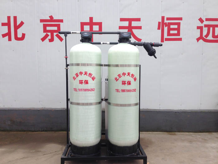 軟水器由兩個樹脂罐(主罐和副罐)水力控制閥、鹽箱三部分組成,控制閥控制水路在主罐和副罐之間切換,確保總有一個罐處于工作狀態,而另一個罐處于再生或備用狀態,再生鹽液靠閥內裝設的文丘里噴射器負壓吸入,再生及清洗用水是另一個罐的軟化出水。對于不同的原水硬度配用不同號碼的水表盤以達到對應的工作和再生周期。