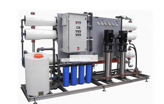 原水(設有壓力保護)→增壓泵(一用一備)→砂過濾器→炭過濾器→硬化器(根據地區不合選用)→緊密過濾器(或稱保安過濾器)→兩頭水箱→一級RO高壓泵→一級RO反滲透零碎→RO水箱→二級RO高壓泵→二級RO水箱→增壓泵→EDI(CEDI)電去離子水(指除去了呈離子方式雜質后的純水)主機→去離子水(指除去了呈離子方式雜質后的純水)箱→去離子水(指除去了呈離子方式雜質后的純水)泵→拋光混床→終端緊密過濾→UV紫外線殺菌→設備用水(水質可以達到18MΩ.cm以上即0.055 μs/ ㎝以下,25 ℃)