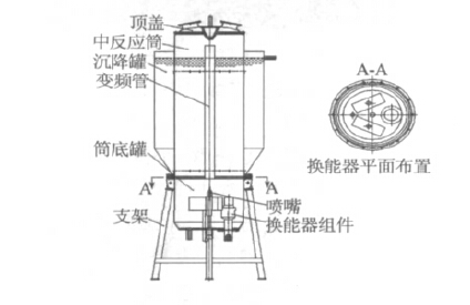 自制復頻超聲波污水處理裝置〔10〕見圖 1。其中 A-A 剖視圖主要體現3 個換能器的平面布置。
