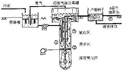 ②一旦這個循環建立并穩定后,空氣注入點轉移到混合區的下部。未處理的污泥通過入流管在混合區空氣注入點的同等高度進入液體循環。 ③壓力和深度導致了高的氧氣傳導速率從而保證混合區內的混合溶液中具有高的溶解氧量。氧化區內高的反應速率保證了有機物能在垂直循環圈的上部被生物氧化。 ④再循環液體沿著井筒的豎壁到達上部箱體中,在那里含有廢氣的氣泡可以將廢氣釋放入大氣中。去掉這些微生物呼吸作用產生的氣態產物,對于防止這些廢氣重新回到系統內影響空氣動力效率是非常必要的。 ⑤混合液體中比例較小的一部分從混合區進入下部第二級消化區。這個區域內溶解氧含量極高,停留時間較長,所以,污泥中剩余的有機物在此被高度氧化。同時所含的溶氣也有利于后續產物池中的固液分離。此過程比較關鍵和比較重要的特點是在這個過程中隨著有機物的氧化,污泥溫度不斷升高,并利用周圍良好的保溫環境使反應器的溫度得到穩定。 ⑥消化后的污泥以極快的速度到達地表的產物箱,這個速度可以保證砂粒和固體物質不會沉積在井底。 ⑦混合液體行至上表面過程中快速的減壓可以導致固體物質從液體中分離并懸浮于表面。分離出來的高濃度生物具有【水處理設備】不同的用處。廢液循環至二級處理以便于達標排放。
