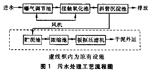 廢水先流入調(diào)節(jié)池進(jìn)行預(yù)曝,然后泵入生物接觸氧化池,出水自流入斜管沉淀池,沉淀出水直接排放。污泥排入貯泥池,再泵入濃縮池,經(jīng)板框壓濾機(jī)處理。