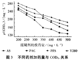 分析混凝實驗結果圖1和圖2可知,在Y280的加藥量為400mg/L時色度能達標,CODcr達標的Y280加藥量為520mg/L,達標時Y280對這種廢水的CODcr去除率為40%,色度去除率為75%。在Y280的投加量為1000mg/L時可出現比較好的水處理效果,此時CODcr去除率達80%以上;色度去除率可達90%以上。 2.2 Y280與常用混凝劑的用量比較 硫酸鋁(AS),聚合氯化鋁(PAC),聚合硫酸鐵(PFS)是常用的混凝劑,為了進一步了解Y280的水處理性能,將其與AS,PAC,PFS進行對比。所有對比實驗在相同的條件下進行,用CODcr達標時各藥劑投加量作為對比依據。實驗結果見圖3。從圖3分析可知,AS的達標投加量為450mg/L,PAC的達標投加量為430mg/L,PFS的達標投加量為330mg/L。結合Y280的實驗結果可看出,在CODcr達標時,Y280的用量分別是AS,PAC,PFS用量的1.15倍,1.21倍和1.58倍。