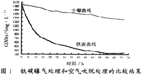 直接將印染—堿減量混合污水置于由等體積鐵屑、焦碳組成的鐵碳反應池[4]中進行曝氣處理試驗。圖1是相同試驗條件下該混合污水經鐵碳曝氣處理和僅經空氣吹脫處理的比較結果。圖1結果表明:在長達72h的處理過程中,鐵碳曝氣處理可使混合污水CODCr去除率達到90.5%,其中前14hCODCr去除速率較快,而直接空氣曝氣吹脫處理實際去除率很低。