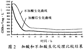 圖2是印染—堿減量混合污水少量加酸調pH值至10左右與不加酸直接生化處理的比較結果,結果表明:不加酸中和的混合污水在生化反應上有一個滯后期,其后雖然CODCr去除速率與加酸中和污水的差不多,但污水處理比較終的殘余CODCr濃度卻比加酸中和污水的殘余CODCr濃度高出約100mg/L,這說明在污水中少量加酸中和有利于生化處理。