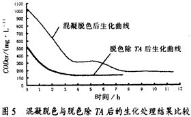 圖5是將印染—堿減量混合污水僅進行化學混凝脫色預處理與脫色后再酸化除TA污水的生化處理比較結果。結果表明:脫色再除TA污水生化性能較好。