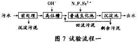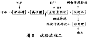 試驗流程二見圖8。此試驗是先進行A/O生化處理,然后進行混凝沉淀后處理的流程試驗。