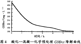 圖4是混合污水經酸化—化學混凝預處理后污水的生化降解曲線。結果表明:經化學混凝處理的出水繼續進行生化處理,可以做到達標排放。