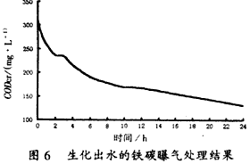 由于混合污水經生化法處理后,CODCr濃度仍有300 mg/L左右,未能達標,因此作為把關措施之一的鐵碳曝氣處理是否有能力處理達標就顯得比較關鍵,處理結果如圖6所示。