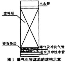 1.2 實驗裝置及工藝參數 本實驗采用上向流曝氣生物濾池(BAF)對含酚廢水進行處理,BAF是一種新型高負荷淹沒式三相反應器,它將生化反應與吸附過濾兩種處理過程合并在同一構筑物中完成。本實驗設計的曝氣生物濾池結構見圖1,主要是由生物反應過濾區、曝氣裝置、反沖洗裝置等三部分組成,生物反應過濾區由生物濾料層和碎石墊層組成,濾料層采用粒徑4-6mm的輕質生物陶粒,高度2.0m,墊層采用10-20mm的碎石,厚度0.2m,濾池有效容積75L;曝氣生物濾池所需空氣通過布置碎石墊層內的穿孔曝氣管直接進入生物濾料層;反沖洗裝置采用配水和配氣聯合系統,實驗中把配氣管與曝氣管合并,把配水管與進水管合并。 ![]() 本實驗設計的工藝參數及操作條件見表2。