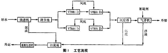 廢水首先通過微濾機去除大部分懸浮物,出水進入調節池,然后中提升泵打入VTBR反應器中進行生化處理,通過風機強制供風使廢水與填料接觸,維持生化反應的需氧量,VTBR反應器出水進入沉淀器,去除一部分脫落的生物膜以減輕氣浮設備的處理負荷,之后流人氣浮設備去除剩余的生物膜,污泥及浮渣送往污泥池濃縮后脫水。